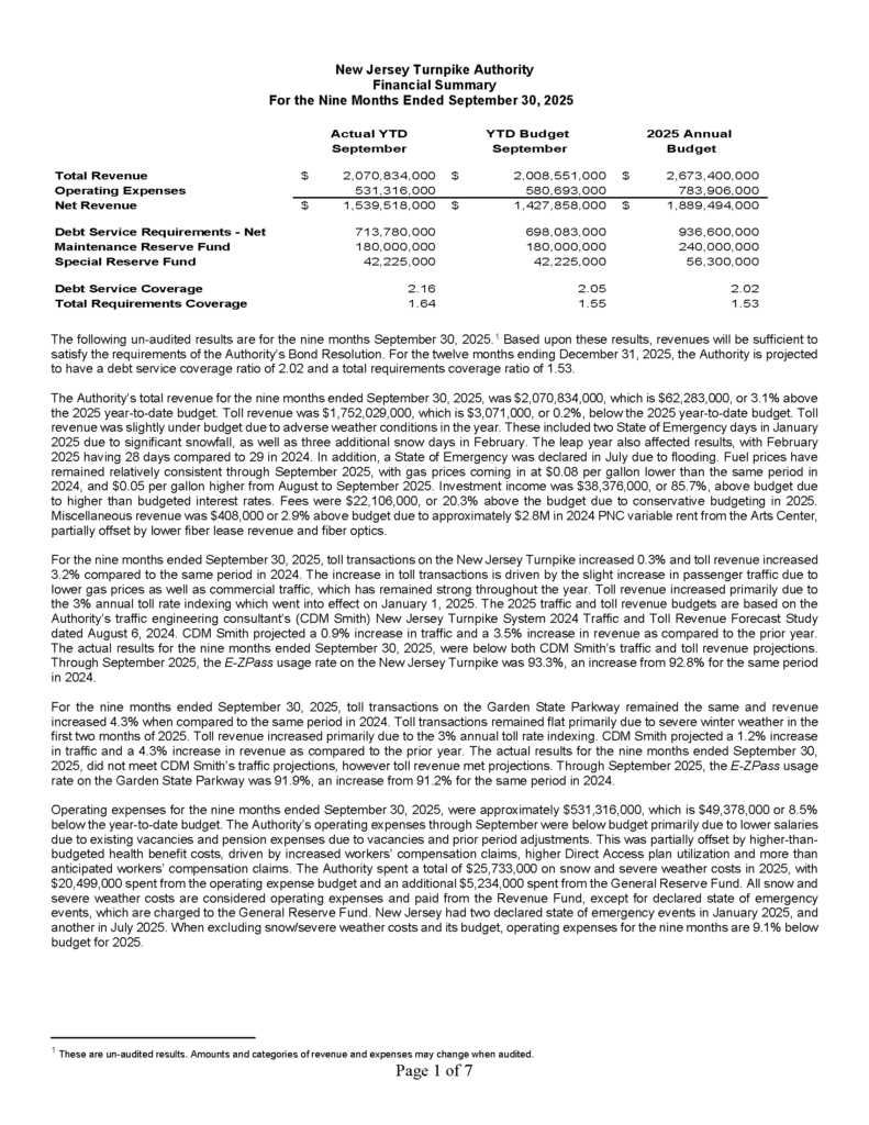 The investor relations information webpages (collectively, the “Investors”) provide information about bonds, notes, and other obligations issued by New Jersey Turnpike Authority (“NJTA”) and financial, statistical and operating data of the NJTA. This information is provided by NJTA on a voluntary basis to assist the investing public, including bondholders, rating analysts, financial advisors, or any other members of the investment community. Access to this information requires review of, and consent to, the conditions contained in the Terms of Use. Information required to be provided pursuant to NJTA’s continuing disclosure undertakings entered into pursuant to Rule 15c2- 12(b)(5) of the Securities and Exchange Commission is available on the Electronic Municipal Market Access (“EMMA”) system of the Municipal Securities Rulemaking Board located at www.emma.msrb.org .
