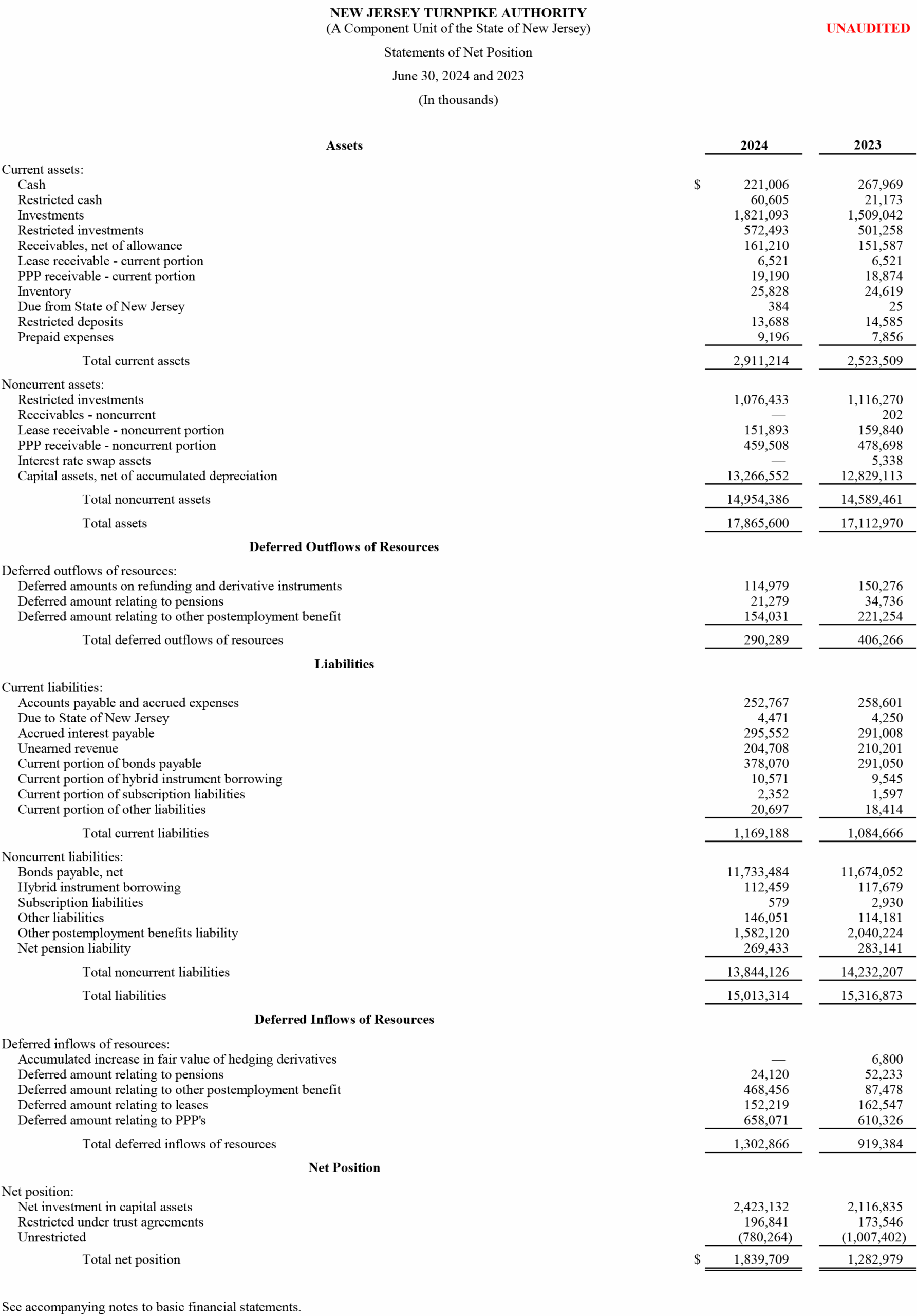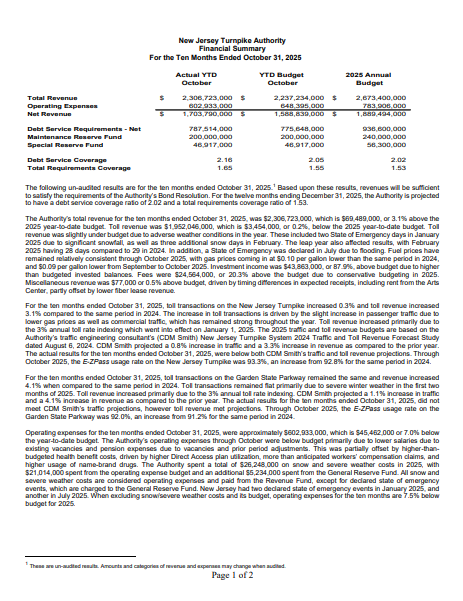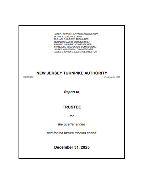 Any financial document contained on the Investors page is marked with a date (the “Dated Date”) and speaks only as of that Dated Date, which may be prior to the date it is posted on this website. You are cautioned not to assume that any information has been updated beyond the Dated Date unless a document expressly states that it constitutes an update. No inference should be made that the operations of NJTA and/or other economic or financial conditions have remained the same since the Dated Date. NJTA has no obligation and expressly disclaims any duty to provide an update of any document contained on the Investors page.