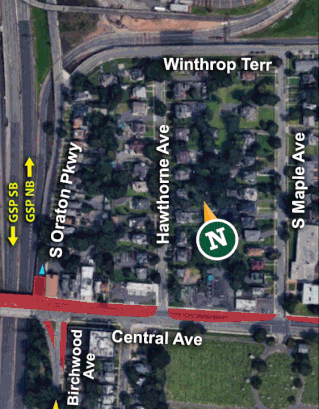 During the weeks of 4/20/20 through 5/11/20, daytime closures of South Oraton Parkway northbound at Central Avenue will be implemented as needed, 8:00 AM to 4:00 PM. During this period, daytime street parking on South Oraton Parkway northbound between Central Avenue and Winthrop Terrace will be eliminated, 8:00 AM to 4:00 PM Monday through Friday. Local access will be maintained via temporary two-way traffic on Winthrop Terrace and South Oraton Parkway. Please refer to the animated and still graphics of the detour below. Work will be supported by East Orange Police.